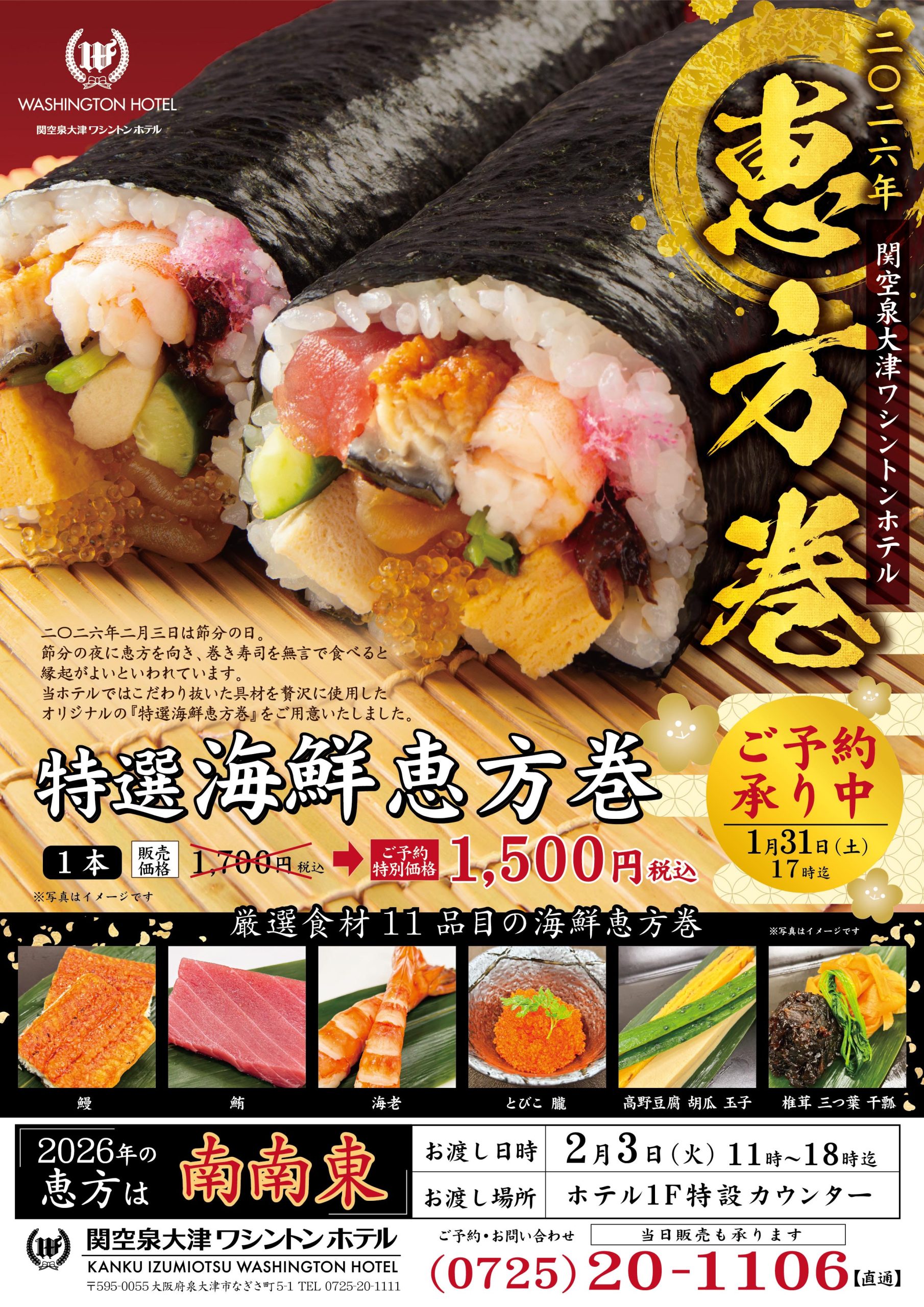 関空泉大津ワシントンホテルでは『2026特選海鮮恵方巻』のご予約を受付中。